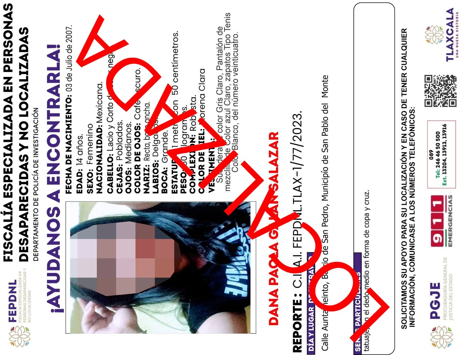 Derivado de la denuncia presentada por los familiares de la adolescente, elementos de Investigación ejecutaron labores de búsqueda por el municipio de Papalotla, donde observaron a una persona con las características fisionómicas reportadas de la menor desaparecida.
