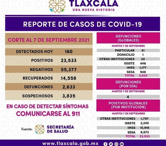 REGISTRA SESA 160 CASOS POSITIVOS DE COVID-19 EN TLAXCALA