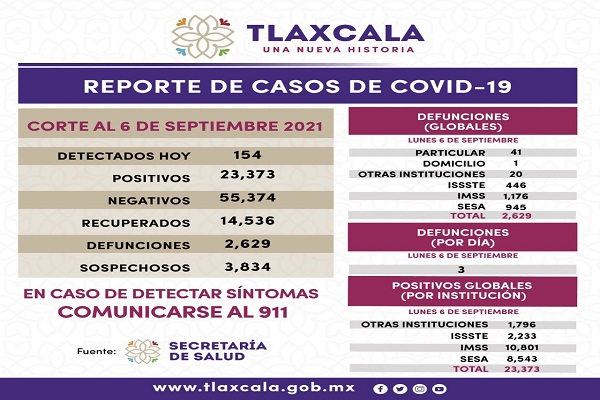 REGISTRA SESA 154 CASOS POSITIVOS DE COVID-19 EN TLAXCALA