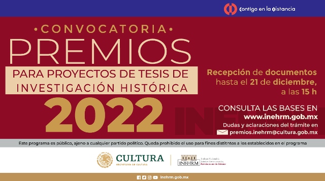 La Secretaría de Cultura del Gobierno de México, a través del Instituto Nacional de Estudios Históricos de las Revoluciones de México (INEHRM), abre la convocatoria a los Premios para Proyectos de Tesis de Investigación Histórica, que corresponden al periodo de marzo a noviembre de 2022. La convocatoria, que estará abierta hasta el 21 de […]
