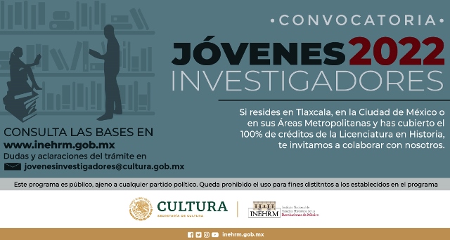 Para residentes de Tlaxcala y Ciudad de México La Secretaría de Cultura del Gobierno de México, a través del Instituto Nacional de Estudios Históricos de las Revoluciones de México (INEHRM), convoca al programa de becas Jóvenes Investigadores, para el periodo correspondiente a los meses de marzo a noviembre de 2022. La convocatoria estará abierta hasta […]