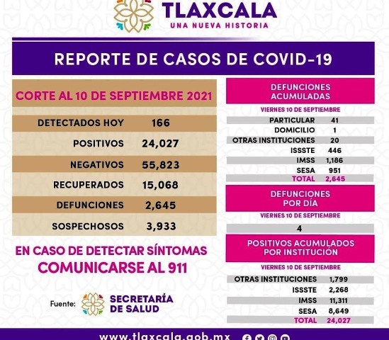 REGISTRA SESA 166 CASOS POSITIVOS DE COVID-19 EN TLAXCALA