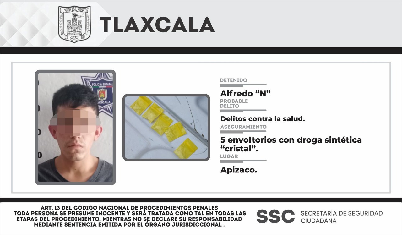 El detenido portaba cinco envoltorios con metanfetamina, droga sintética mejor conocida como cristal.Con el objetivo de combatir y prevenir delitos contra la salud en el estado de Tlaxcala; en su modalidad de narcomenudeo, la Secretaría de Seguridad Ciudadana (SSC) detuvo el día jueves a una persona en el municipio de Apizaco, luego de detectar que […]