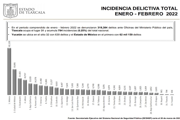 TLAXCALA SE COLOCÓ COMO LA SEGUNDA ENTIDAD CON MENOR INCIDENCIA DELICTIVA EN EL PRIMER BIMESTRE DE 2022: SESNSP