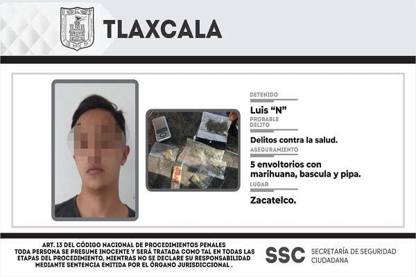 POLICÍA ESTATAL DETIENE EN ZACATELCO A PRESUNTO RESPONSABLE DE DELITOS CONTRA LA SALUD