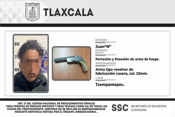 El detenido no justificó legalmente los motivos de la portación del arma de fuego calibre 22.Personal de la Dirección de Seguridad perteneciente a la Secretaría de Seguridad Ciudadana (SSC), detuvo en el municipio de Tzompantepec a una persona que portaba un arma de fuego.Los hechos acontecieron cuando los elementos de la Policía Estatal que se […]