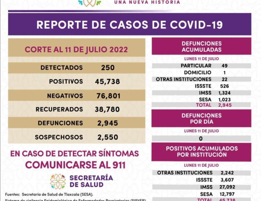 REGISTRA SESA 250 CASOS POSITIVOS Y CERO DEFUNCIONES DE COVID-19 EN TLAXCALA