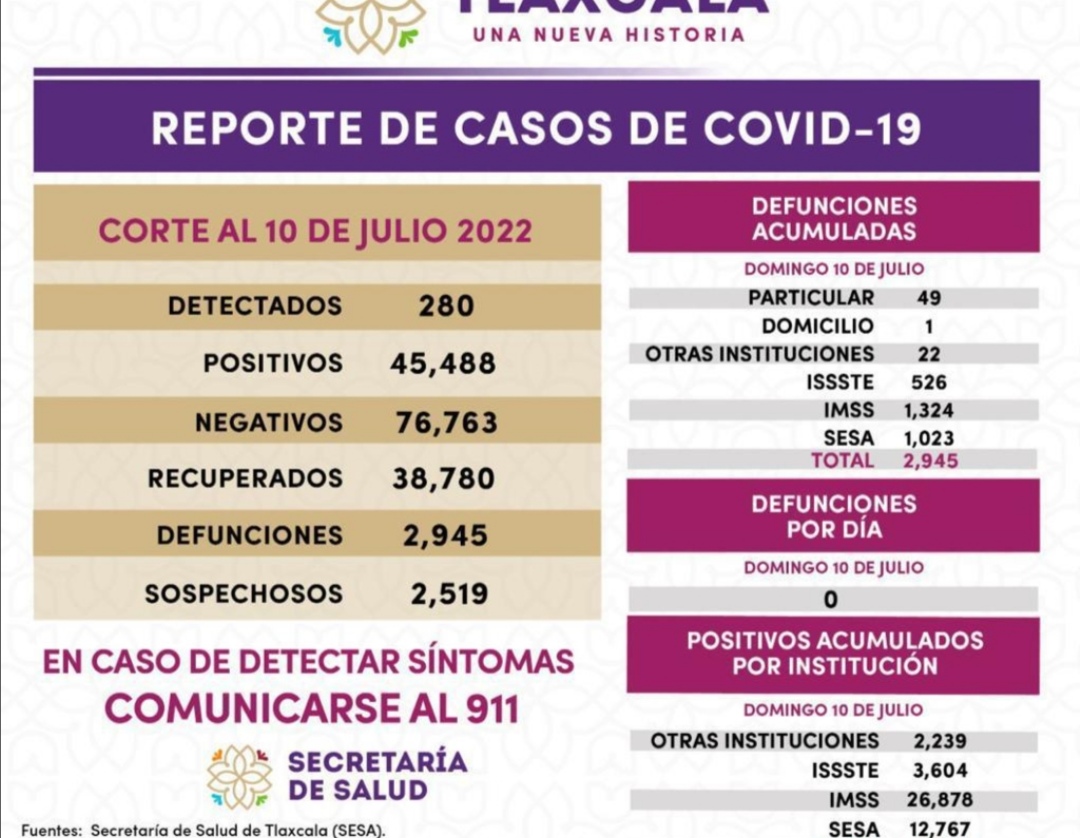 REGISTRA SESA 280 CASOS POSITIVOS Y CERO DEFUNCIONES DE COVID-19 EN TLAXCALA