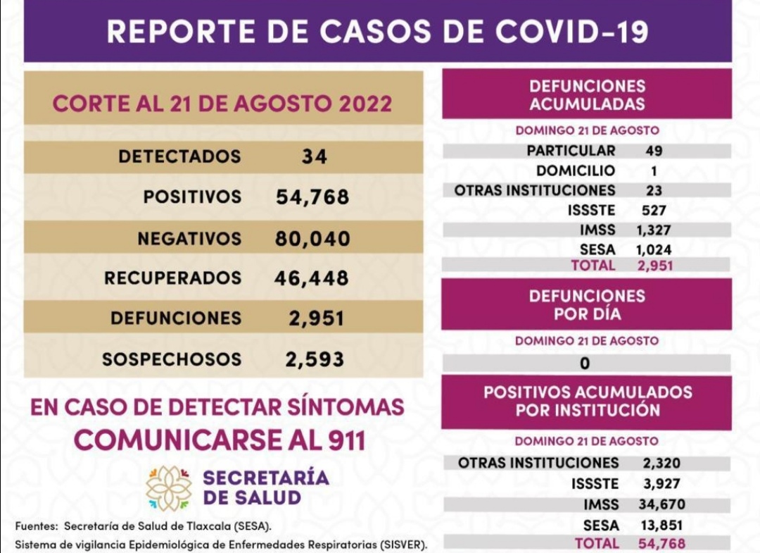 REGISTRA SESA 34 CASOS POSITIVOS Y CERO DEFUNCIONES DE COVID-19 EN TLAXCALA