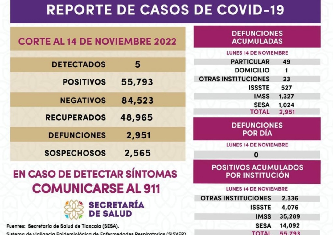 REGISTRA SESA 5 CASOS POSITIVOS Y CERO DEFUNCIONES DE COVID-19 EN TLAXCALA