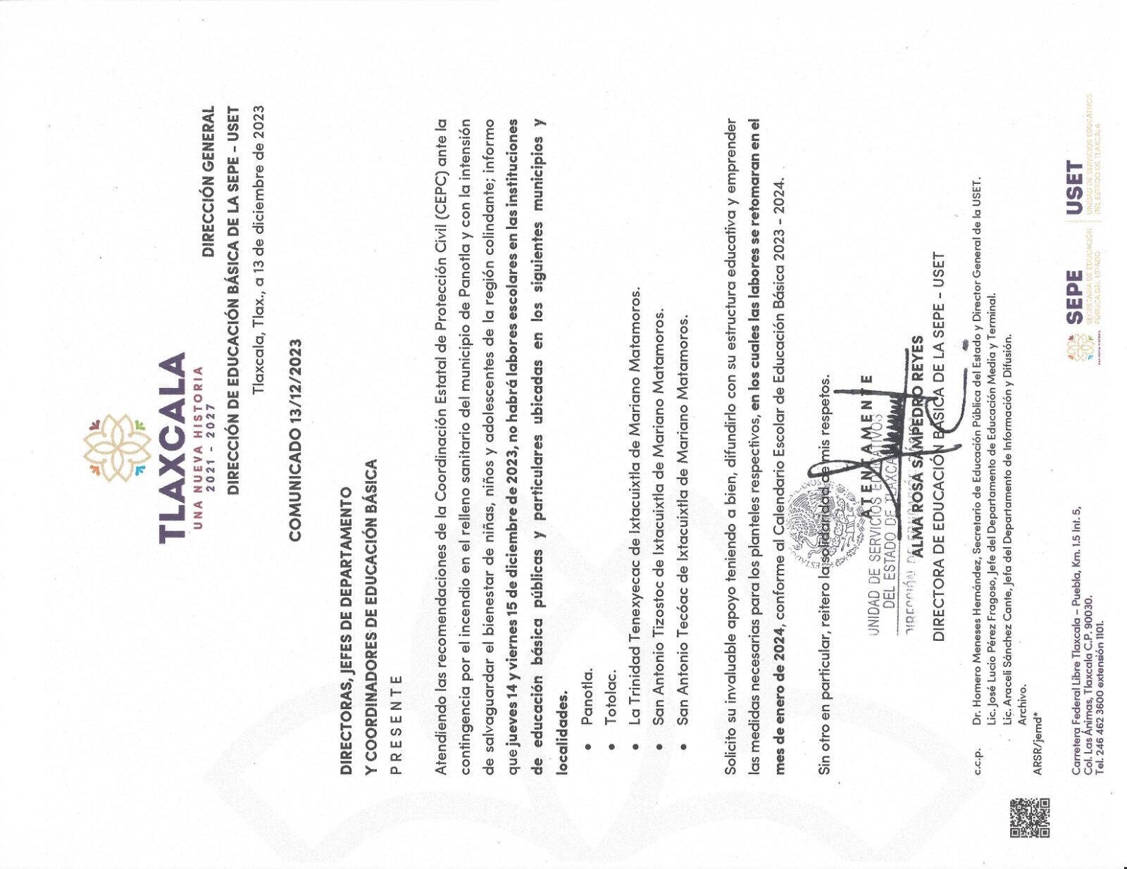 La Secretaría de Educación Pública del Estado y la Unidad de Servicios Educativos del Estado de Tlaxcala (SEPE-USET), informaron que con el objetivo de cuidar la salud de estudiantes de educación básica de instituciones aledañas al relleno sanitario de Panotla, se mantiene la suspensión de actividades escolares. Por recomendación de la Coordinación Estatal de Protección […]