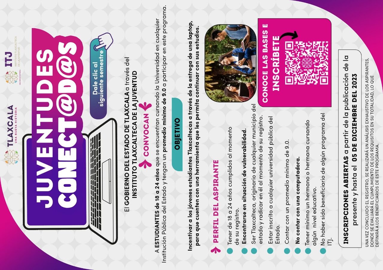 Podrán postularse hasta el próximo 5 de diciembre del 2023 El Gobierno del estado de Tlaxcala, a través del Instituto Tlaxcalteca de la Juventud (ITJ), convoca a estudiantes de entre 18 y 24 años que actualmente cursan la universidad en cualquier Instituto Público del Estado a participar en la convocatoria, denominada «Juventudes Conectada». Dicha iniciativa […]