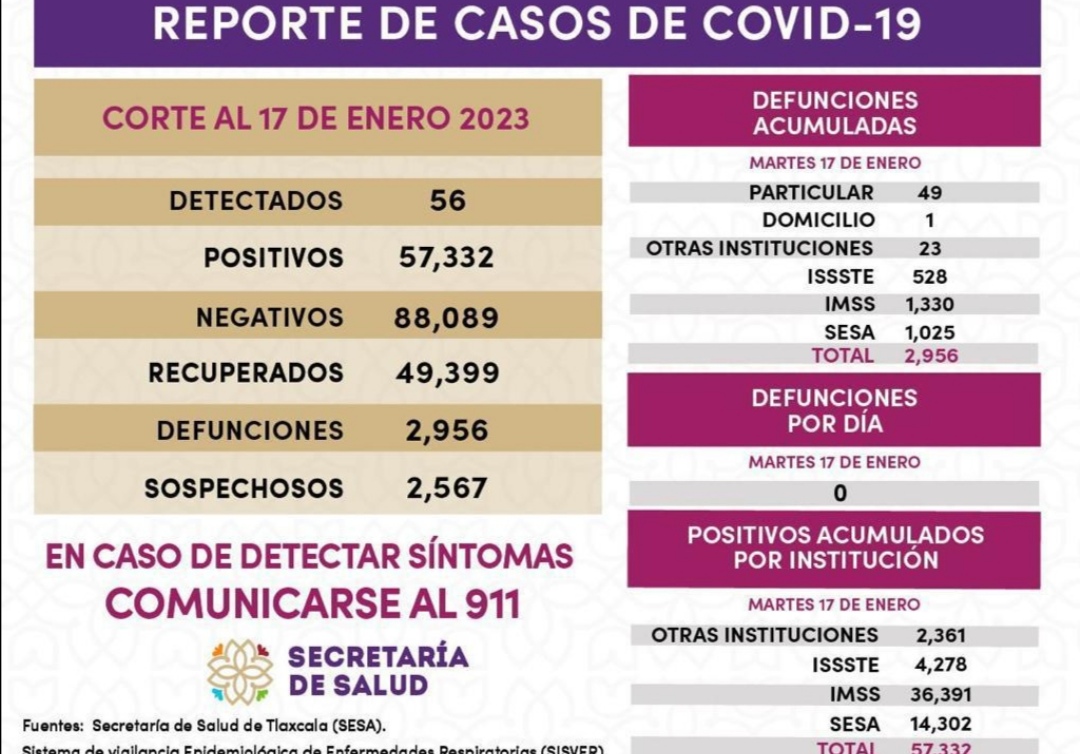 REGISTRA SECTOR SALUD 56 CASOS POSITIVOS Y CERO DEFUNCIONES DE COVID-19 EN TLAXCALA