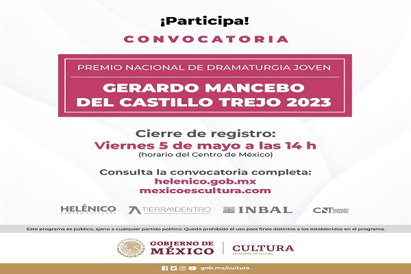 El Premio Gerardo Mancebo del Castillo Trejo 2023 refrenda su compromiso con las letras mexicanas A través de una convocatoria dirigida a dramaturgas y dramaturgos de entre 20 y 29 años de edad, el Centro Cultural Helénico ofrece un reconocimiento económico de 120,000 mil pesos, más la producción de la obra ganadora La Secretaría de […]