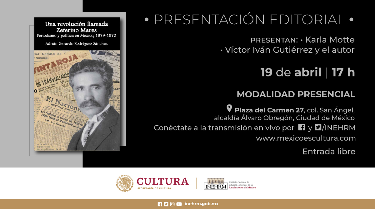 Para incentivar el conocimiento de las y los protagonistas en diferentes etapas de la historia mexicana, la Secretaría de Cultura federal, a través del Instituto Nacional de Estudios Históricos de las Revoluciones de México (Inehrm), presentará las novedades editoriales: Una revolución llamada Zeferino Mares. Periodismo y política 1879-1970, e Inventoras de la Matria. Sobre las huellas visibles e […]