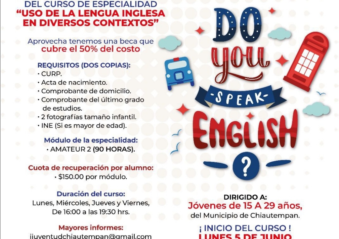 Aprovecha la beca del 50 por ciento del costo del curso que inicia el 5 de junio. El Ayuntamiento de Chiautempan a través del Instituto Municipal de la Juventud (IMJ), invita a la población chiautempense de 15 a 29 años de edad a inscribirse al curso de especialidad «Uso de la lengua inglesa en diversos […]