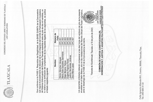 Se publica la lista de las y los aspirantes que pasan a la siguiente fase de selección para ser la o el nuevo integrante del Comité de Participación Ciudadana. Tlaxcala, Tlax., a 19 de julio de 2023 En cumplimiento a la fase segunda Requisitos de Elegibilidad de la Base Quinta de la Convocatoria que regula el […]