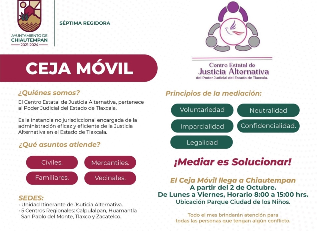 Se instalará en el mes de octubre en el Parque Ciudad de los Niños. El Ayuntamiento de Chiautempan a través de la Séptima Regiduría, invita a la población a aprovechar los servicios que ofrece la Unidad Itinerante del Centro Estatal de Justicia Alternativa (CEJA) perteneciente al Tribunal Superior de Justicia del Estado (TSJE). El CEJA […]