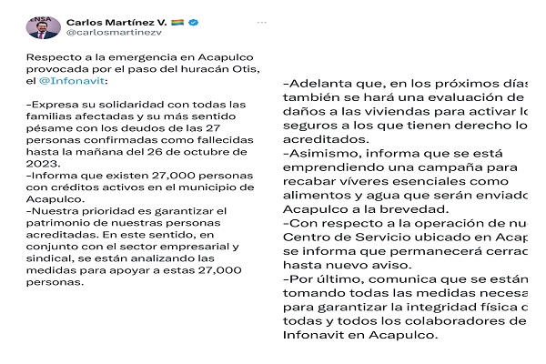 INFONAVIT EXPRESA SU APOYO A LAS Y LOS DAMNIFICADOS ANTE EL PASO DEL HURACÁN OTIS