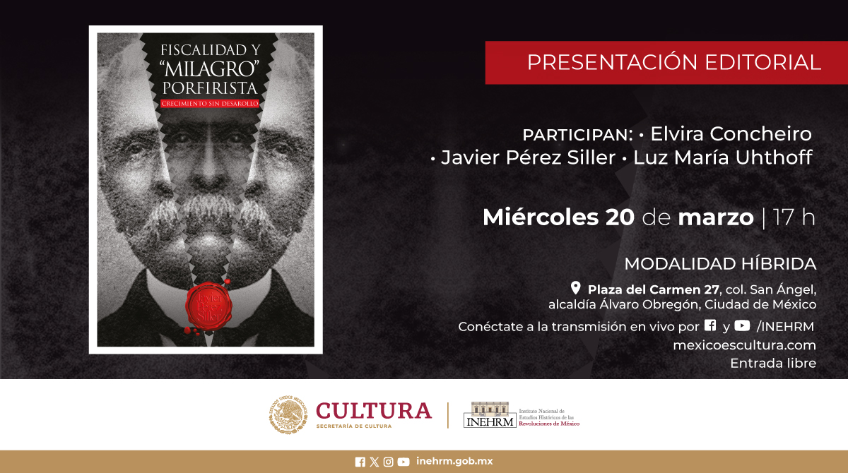 La Secretaría de Cultura federal, a través del Instituto Nacional de Estudios Históricos de las Revoluciones de México (Inehrm), invita a la presentación del segundo volumen de la trilogía Fiscalidad y poder en el porfirismo, de Javier Pérez Siller. Con el título de Fiscalidad y «milagro» porfirista. Crecimiento sin desarrollo, la presentación editorial se llevará en el […]