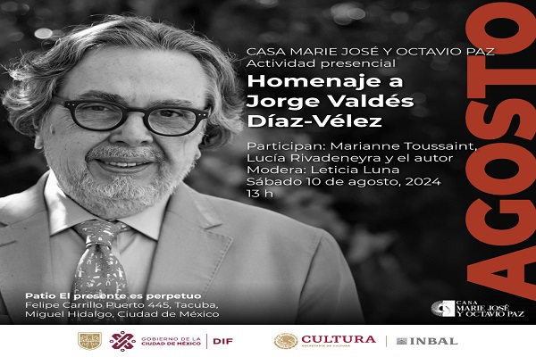 Como reconocimiento a su trayectoria en las letras mexicanas, la Casa Marie José y Octavio Paz realizará un homenaje al poeta y diplomático mexicano, ganador del Premio Nacional de Poesía Aguascalientes 1998 y miembro honorario del Sistema Nacional de Creadores de Arte, Jorge Valdés Díaz-Vélez (Torreón, Coahuila, México, 1955). En el patio “El presente es […]