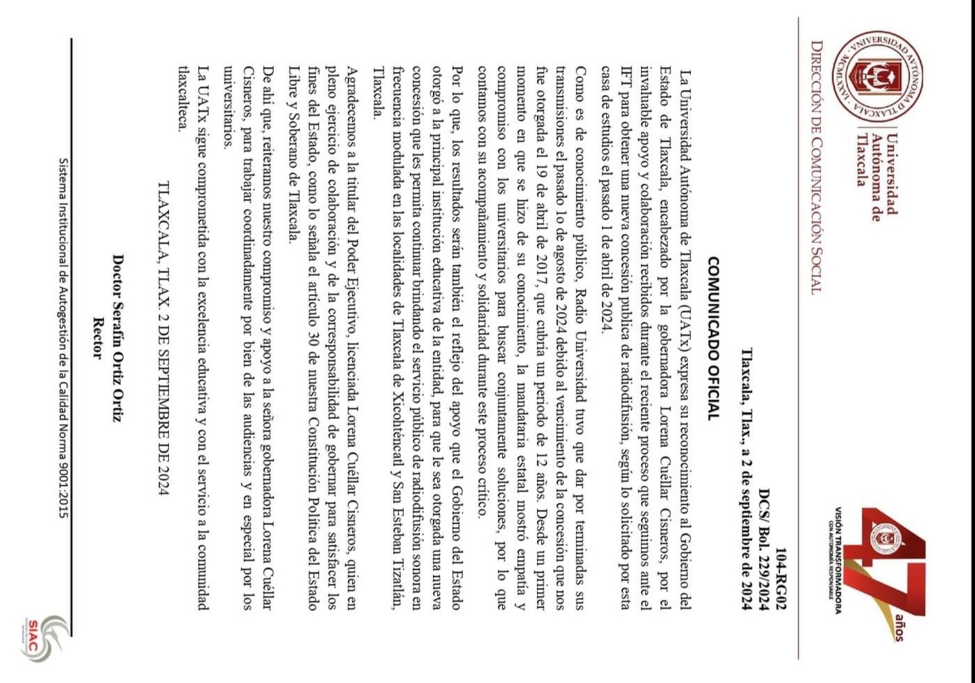 La Universidad Autónoma de Tlaxcala (UATx) expresa su reconocimiento al Gobierno del Estado de Tlaxcala, encabezado por la gobernadora Lorena Cuéllar Cisneros, por el invaluable apoyo y colaboración recibidos durante el reciente proceso que seguimos ante el IFT para obtener una nueva concesión pública de radiodifusión, según lo solicitado por esta casa de estudios el […]