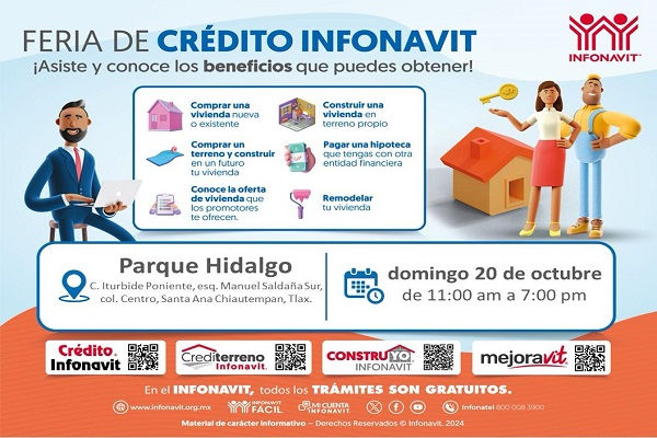 Se realizará una Feria de Crédito en el Parque Hidalgo ubicado en el municipio de Santa Ana Chiautempan. El Instituto del Fondo Nacional de la Vivienda para los Trabajadores (Infonavit) realizará una Feria de Crédito en Santa Ana Chiautempan, con el objetivo de acercar sus diferentes productos de financiamiento a las y los derechohabientes. Detalles del […]