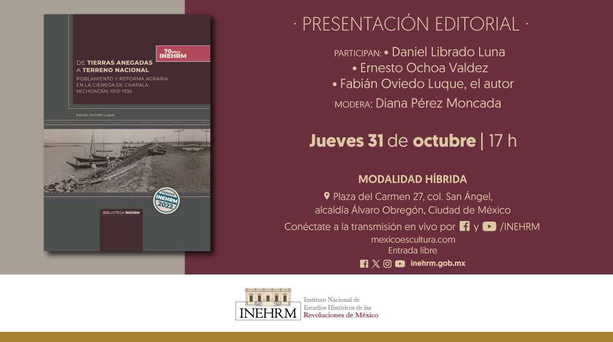El Instituto Nacional de Estudios Históricos de las Revoluciones de México (INEHRM), dependencia de la Secretaría de Cultura del Gobierno de México, invita a la presentación del libro: De tierras anegadas a terreno nacional, Poblamiento y reforma agraria en la Ciénega de Chapala, Michoacán, 1910-1935, del historiador Fabián Oviedo Luque, del Instituto de Investigaciones Históricas de […]