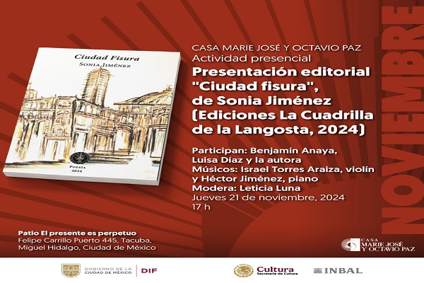 En la Casa Marie José y Octavio Paz presentarán Ciudad Fisura, poemario de Sonia Jiménez
