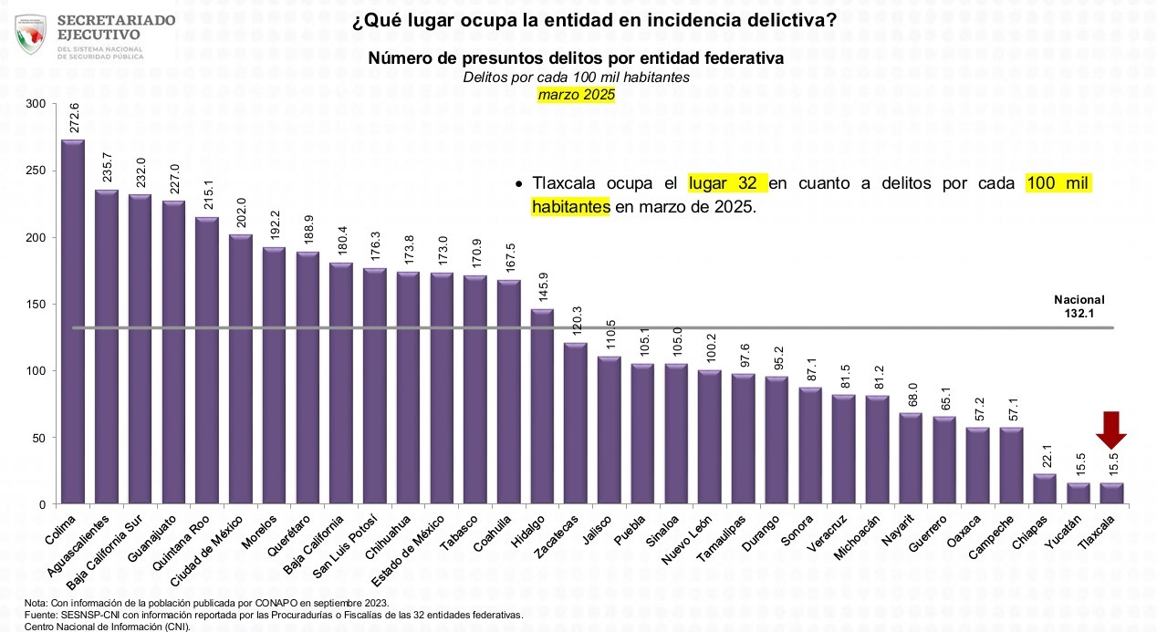 POR PRIMERA VEZ, TLAXCALA OCUPA EL LUGAR 32 CON EL MENOR NÚMERO DE DELITOS POR CADA 100 MIL HABITANTES: SESNSP
