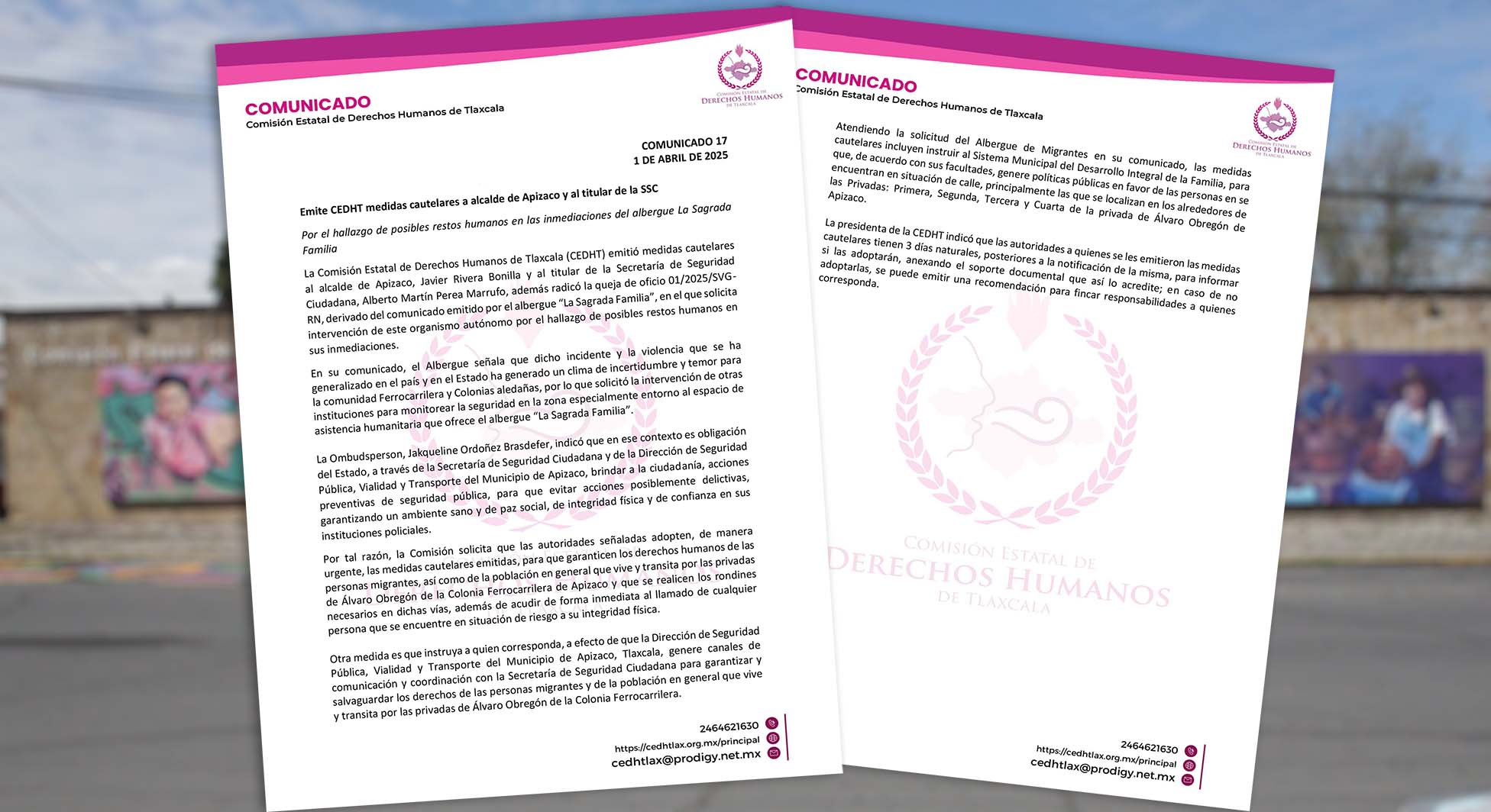 Por el hallazgo de posibles restos humanos en las inmediaciones del albergue La Sagrada Familia La Comisión Estatal de Derechos Humanos de Tlaxcala (CEDHT) emitió medidas cautelares al alcalde de Apizaco, Javier Rivera Bonilla y al titular de la Secretaría de Seguridad Ciudadana, Alberto Martín Perea Marrufo, además radicó la queja de oficio 01/2025/SVG-RN, derivado […]