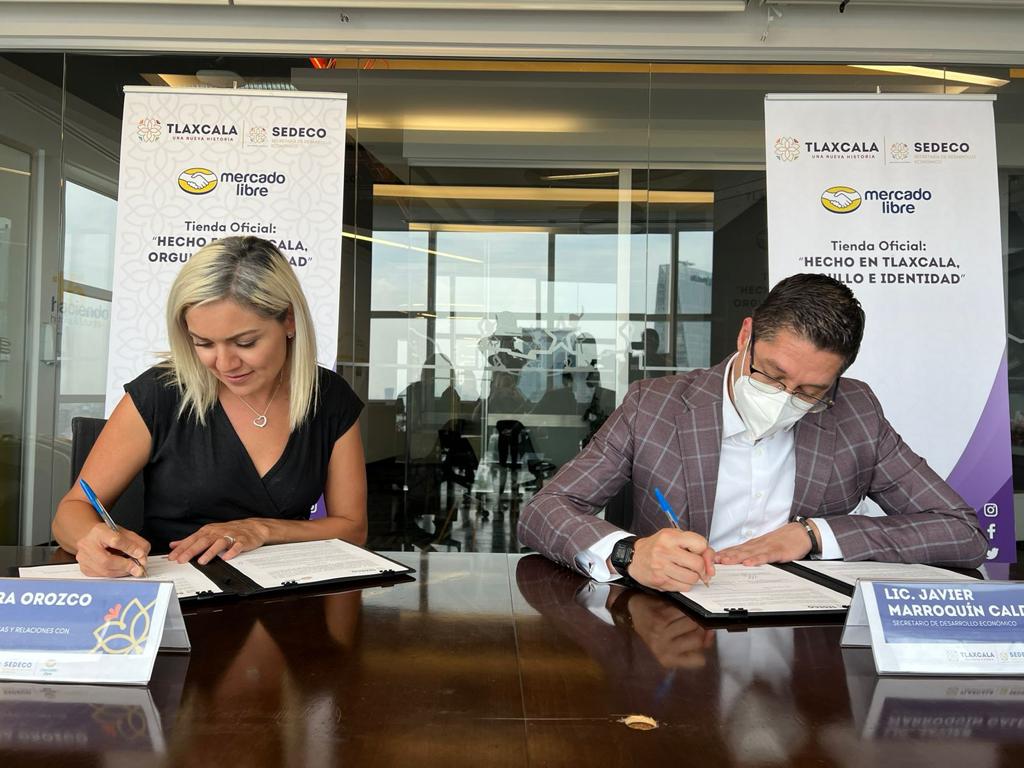 En las instalaciones de Mercado Libre en Ciudad de México, el secretario de Desarrollo Económico, Javier Marroquín Calderón y la directora de Políticas Públicas y Relaciones con Gobierno de Mercado Libre, Alehira Orozco Reyes, firmaron el acuerdo que tiene como objetivo que quienes elaboran productos tlaxcaltecas puedan ampliar su exposición y ventas a nivel nacional e internacional.