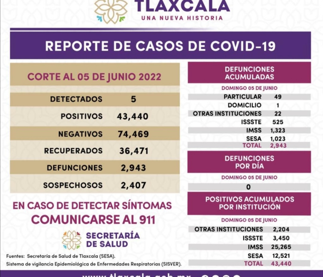 Los datos de la SESA registrados en la plataforma nacional del Sistema de Vigilancia Epidemiológica de Enfermedades Respiratorias (Sisver), confirmaron cinco casos positivos de Covid-19 y cero defunciones, el 05 de junio de 2022 en la entidad.