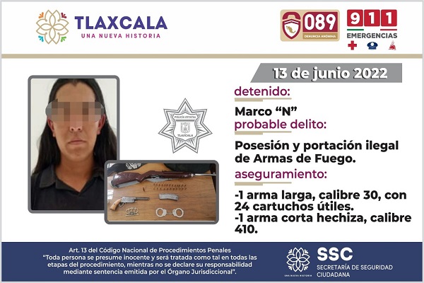Al tratarse de un hecho probablemente delictivo, y tras no justificar la procedencia y posesión de las armas de fuego, el sujeto identificado como Marco N. de 21 años de edad, fue detenido conforme a sus derechos para ser puesto a disposición ante la representación social competente, mientras que el menor de edad fue canalizado ante las estancias correspondientes quien determinará su situación legal.