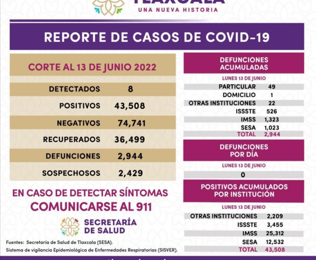 Los datos de la SESA registrados en la plataforma nacional del Sistema de Vigilancia Epidemiológica de Enfermedades Respiratorias (Sisver), confirmaron ocho casos positivos de Covid-19 y cero defunciones, el 13 de junio de 2022 en la entidad.