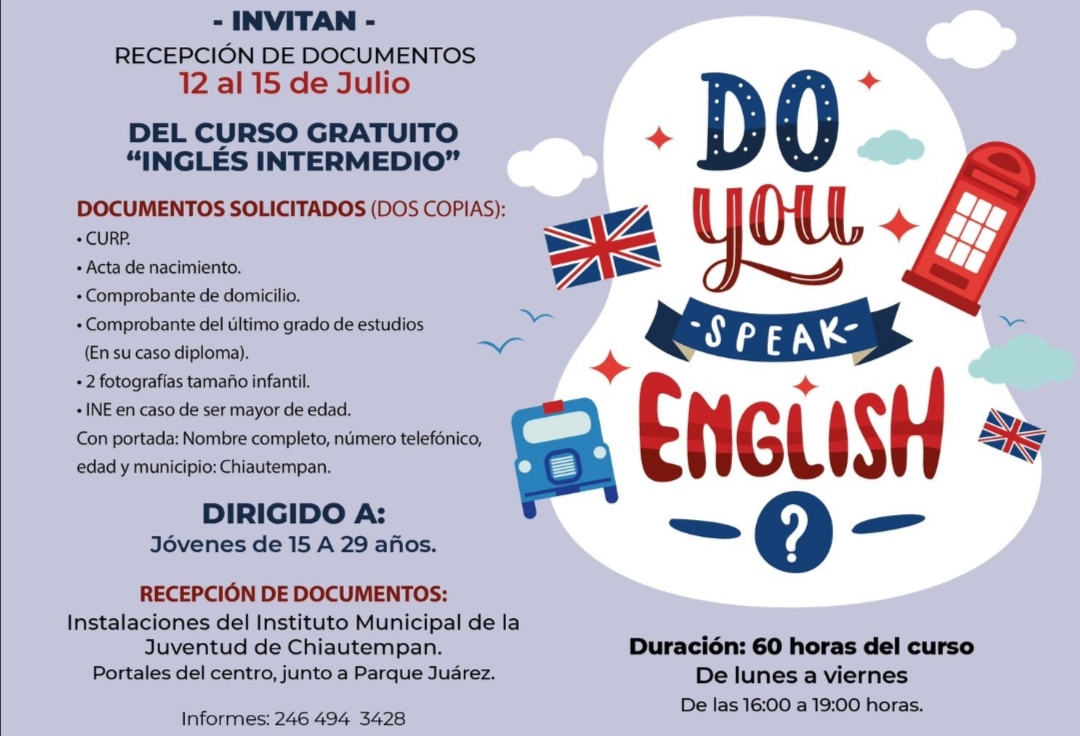 El Ayuntamiento de Chiautempan a través del Instituto Municipal de la Juventud invita a todos los jóvenes de entre 15 y 29 años de edad al Curso gratuito de Ingles Intermedio.