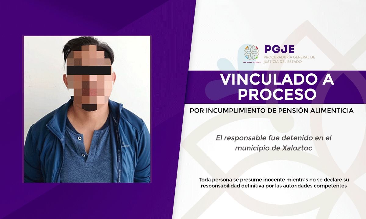 El responsable fue detenido en el municipio de Xaloztoc_Elementos de la Procuraduría General de Justicia del Estado (PGJE) llevaron a cabo la orden de aprehensión contra un hombre identificado como Víctor “N”. de 30 años de edad por incumplir con la pensión alimenticia para dos menores de edad. El masculino dejó de proporcionar dinero para los alimentos de sus hijos, por lo que se interpuso la denuncia correspondiente ante el Ministerio Público del fuero común, quien integró la carpeta de investigación. Posteriormente, el Juez de la causa libró la orden de aprehensión en su contra, y elementos de la Policía de Investigación se dieron a la tarea de ubicarlo en Xaloztoc, sobre la calle Francisco Sarabia. Con estas acciones, la Procuraduría General de Justicia del Estado, realiza las indagatorias correspondientes para deslindar las respectivas responsabilidades.