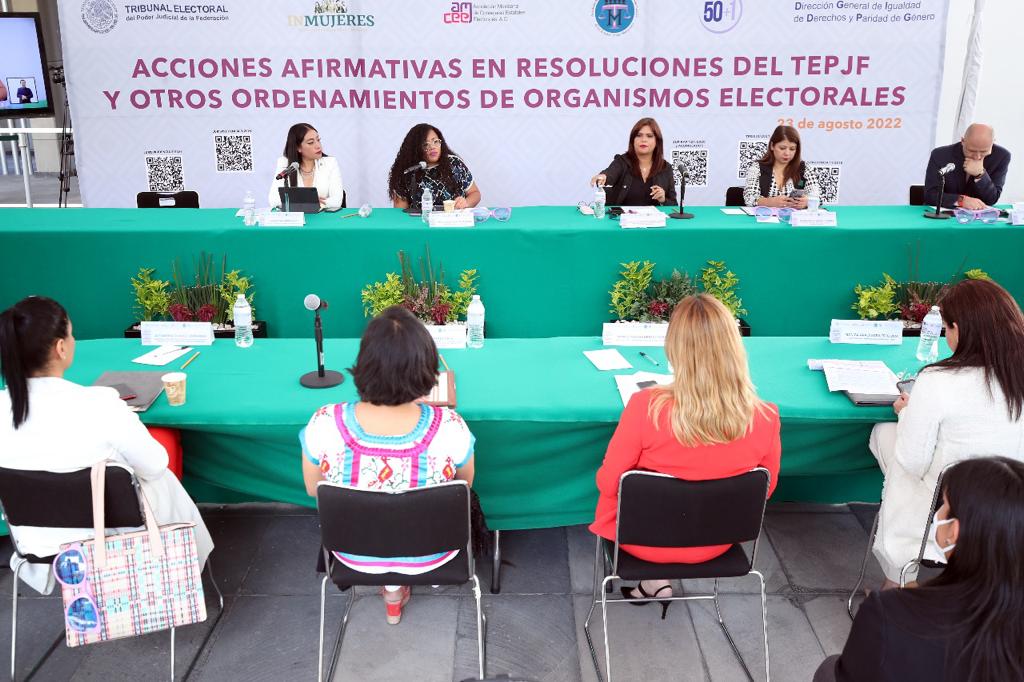 Ante representantes del Instituto Nacional de las Mujeres (Inmujeres), de las Asociaciones Mexicana de Consejeras Estatales Electorales y de magistradas y magistrados electorales locales de los Estados Unidos Mexicanos, así como del Colectivo 50 +1 y la Dirección General de Igualdad de Derechos y Paridad de Género, la Magistrada Presidenta del TET expuso que a partir de la implementación de una acción afirmativa, impulsada desde la jurisdicción electoral, se logró que por primera vez, en la historia del Congreso de Tlaxcala, se integrara en su mayoría por mujeres.