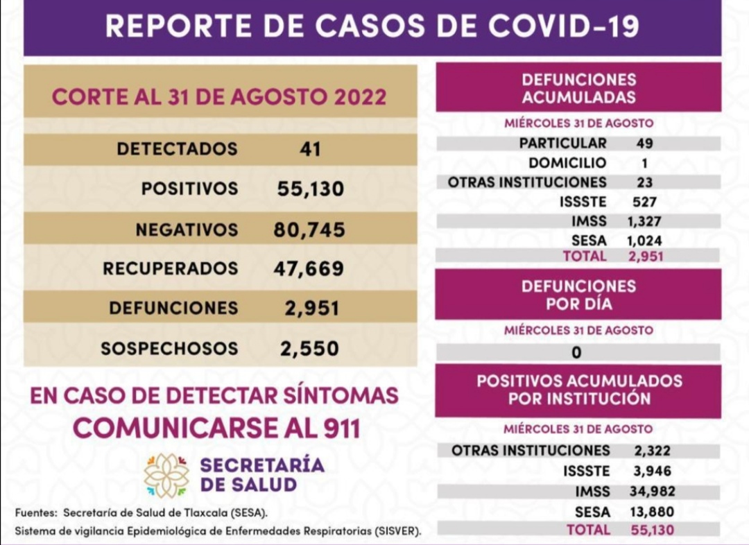 Los datos de la SESA registrados en la plataforma nacional del Sistema de Vigilancia Epidemiológica de Enfermedades Respiratorias (Sisver), confirmaron 41 casos positivos de Covid-19 y cero defunciones, el 31 de agosto de 2022 en la entidad.