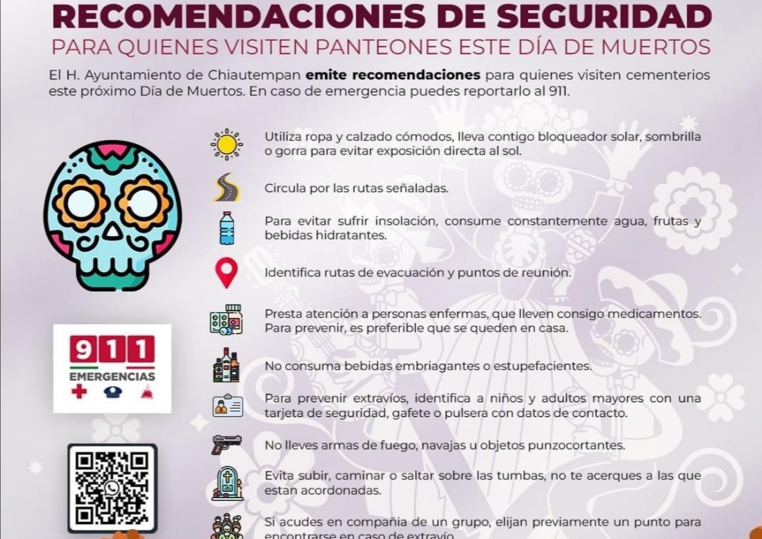El Ayuntamiento de Chiautempan a través del la Dirección de Seguridad Pública emite recomendaciones para quienes visiten panteones en esta temporada de Todos Santos y Día de Muertos.