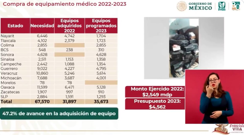 En la compra de equipamiento médico entre 2022 y 2023, Robledo Aburto indicó que 14 estados que iniciaron en el año pasado con la implementación de IMSS–Bienestar, presentaron una necesidad de 67 mil 570 equipos, durante 2022 se compraron 31 mil 897 equipos y para 2023 se tiene programado adquirir 35 mil 673 equipos medicinales, del equipamiento médico a comprar, mil 723 corresponden al estado de Tlaxcala.