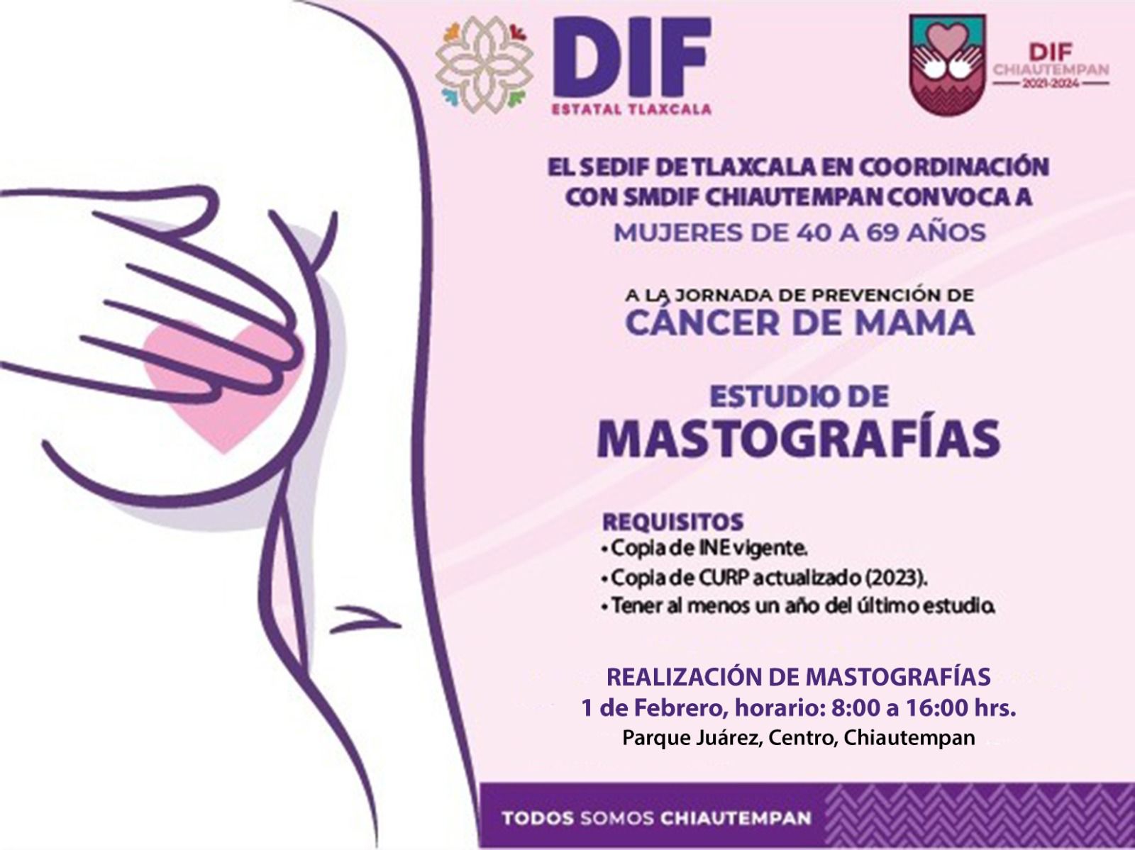 El Ayuntamiento de Chiautempan a través del Sistema Municipal para el Desarrollo Integral de la Familia (SMDIF), convoca a mujeres de 40 a 69 años de edad a participar en la “Jornada de Prevención de Cáncer de Mama”, este 1 de febrero, en el parque Juárez.