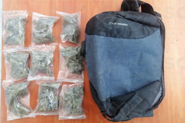 Por tal motivo, los elementos procedieron a interceptar el trayecto de la persona para indagar la situación, al darle alcance se procedió a realizarle una inspección preventiva, entre sus pertenencias se le encontraron nueve bolsas que en su interior contiene hierba verde con las características propias a la marihuana.