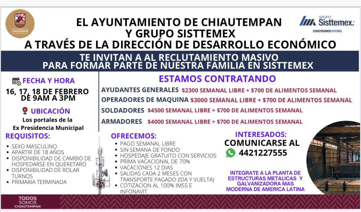 El Ayuntamiento de Chiautempan y el Grupo Sisttemex convocan a toda la sociedad masculina a participar en el reclutamiento masivo este 16, 17 y 18 febrero, en los portales de la ex presidencia municipal de 9:00 a 15:00 horas.