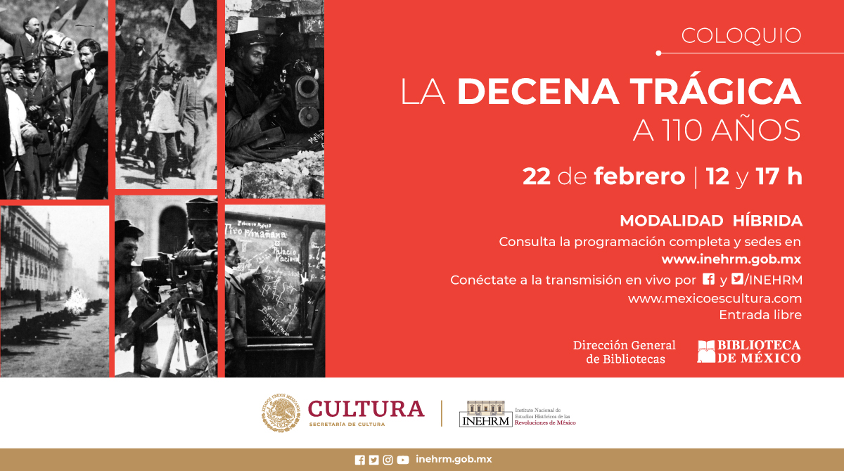 Con motivo de la conmemoración por el 110 Aniversario de la llamada “Decena Trágica” y del aniversario luctuoso de Francisco I. Madero, la Secretaría de Cultura del Gobierno de México, a través del Instituto Nacional de Estudios Históricos de las Revoluciones de México y de la Biblioteca de México “José Vasconcelos”, llevará a cabo el coloquio académico “La Decena Trágica. A 110 años”, y dos muestras iconográficas sobre los personajes y momentos claves de aquellos trágicos días que conmovieron a México.