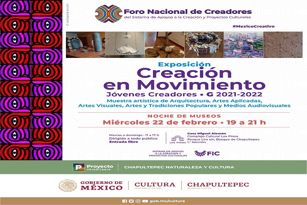 La Secretaría de Cultura del Gobierno de México, a través del Sistema de Apoyos a la Creación y Proyectos Culturales (SACPC), invita al público este miércoles 22 de febrero, de las 17:00 a las 22:00 horas, a visitar la exposición “Creación en movimiento” en el marco de la Noche de Museos que se realizará en el Complejo Cultural Los Pinos, actividad que tiene lugar los últimos miércoles de cada mes en la Ciudad de México.