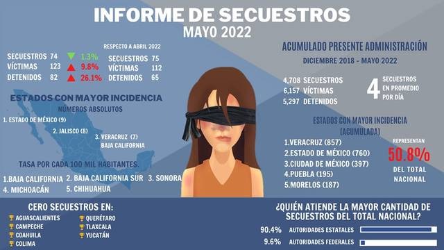 El informe refiere que las entidades federativas que no reportaron ningún secuestro son: Aguascalientes, Campeche, Coahuila, Colima, Querétaro y Yucatán. En contraparte, los estados con mayor incidencia son el Estado de México, Jalisco y Veracruz.