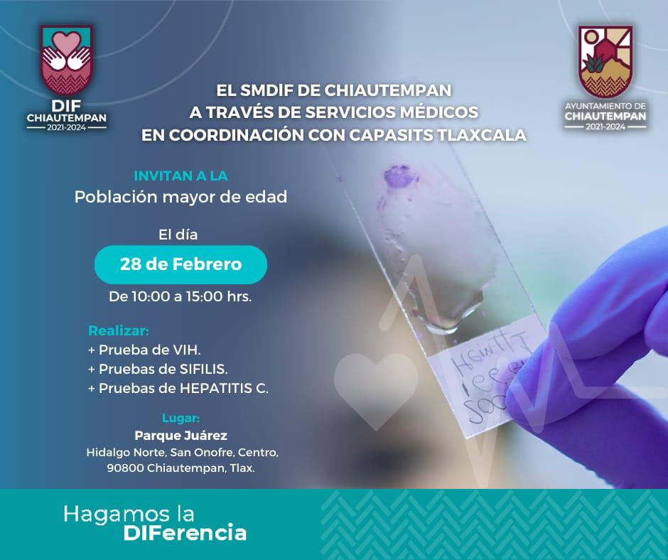 El Ayuntamiento de Chiautempan a través del Sistema Municipal para el Desarrollo Integral de la Familia (SMDIF), realizará este martes 28 de febrero, pruebas gratuitas de VIH, Sífilis y Hepatitis C.