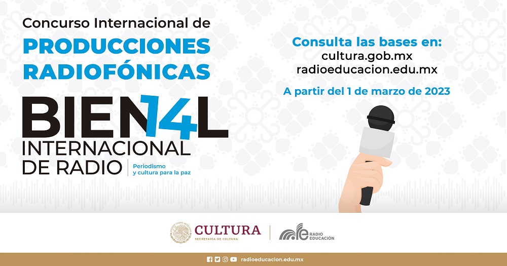 La Secretaría de Cultura del Gobierno de México, a través de Radio Educación, abre la convocatoria para participar en el Concurso Internacional de Producciones Radiofónicas de la 14° Bienal Internacional de Radio, el evento tradicional que por más de 25 años ha organizado la institución y que en 2023 tendrá por tema: “Periodismo y cultura para la paz”.