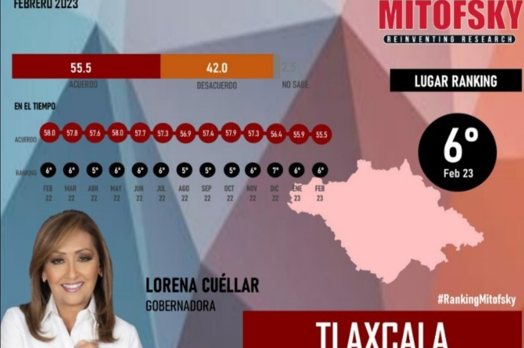 Cabe destacar que en promedio, más de la mitad de la población tlaxcalteca mayor de 18 años que fue consultada por Mitofsky aprobó el mandato de la gobernadora Lorena Cuéllar Cisneros.